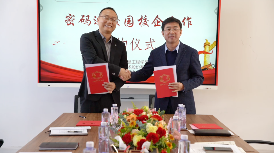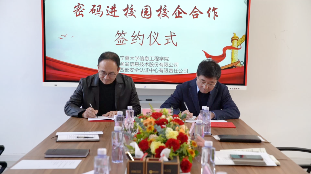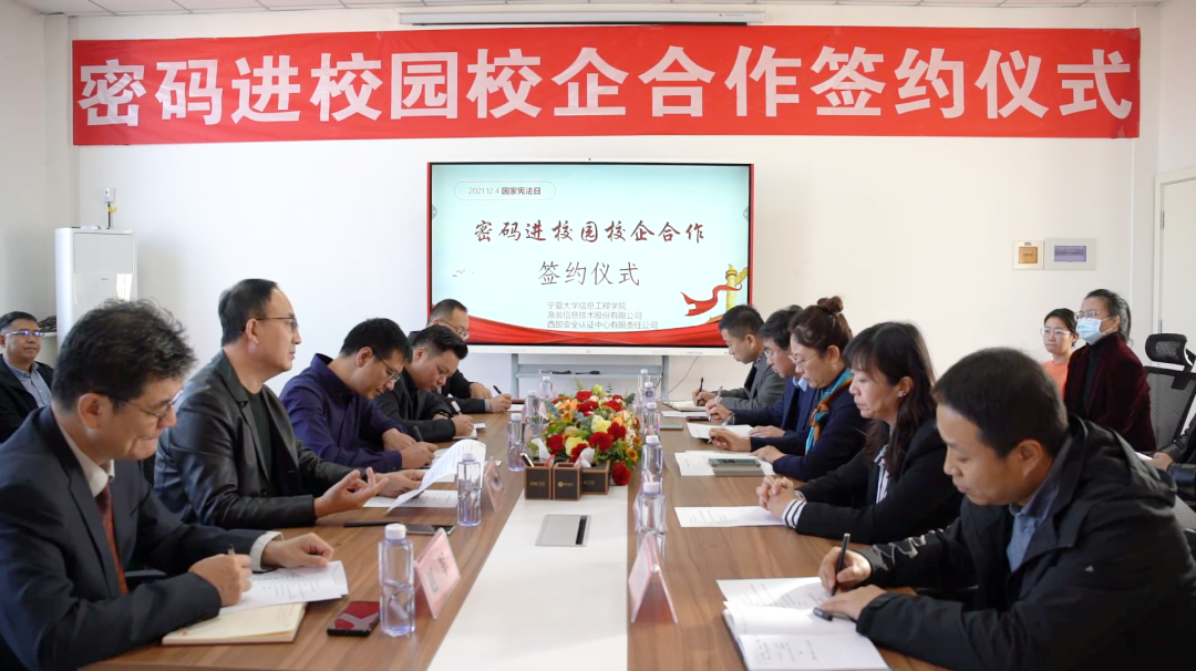 在第八个国家宪法日来临之际,为深入贯彻落实《中华人民共和国密码法》,进一步加快密码专业人才队伍建设步伐,打通我区密码产学研创新链、价值链,12月1日,“密码进校园校企合作签约仪式”在宁夏大学信息工程学院成功举行。此次签约仪式由宁夏密码管理局指导,宁夏商用密码协会会员单位凯发K8信息技术股份有限公司、西部安全认证中心有限责任公司同宁夏大学信息工程学院签署战略合作协议,共同为我区密码学科建设、密码实训基地建设、密码人才培养贡献力量。宁夏密码管理局副局长李大苞,商密处副处长丁杰,宁夏大学信息工程学院党委书记武林波、院长冯锋、副书记孙莉、副院长杨军、学科主任李贯峰,凯发K8信息技术股份有限公司董事长郭刚,西部安全认证中心有限责任公司常务副总经理耿方,区内其他商密企业代表等出席了签约仪式,签约仪式由宁夏商用密码协会秘书长赵军主持。